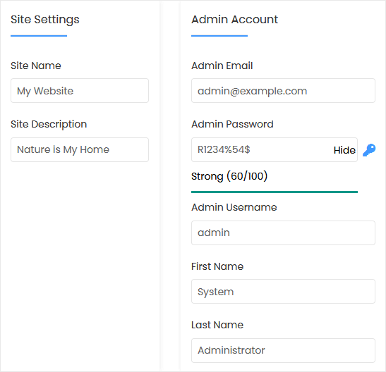 • Admin Username: Your new Pubvana username (for security reasons, do not use the administrator or the admin username).